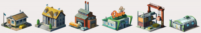 Atomhawk worked with Small Giant Games to create a range of backdrops which sit behind the game’s main play area. These environments needed to capture a diverse range of international locations, from rolling farmland to Brutalist cityscapes.