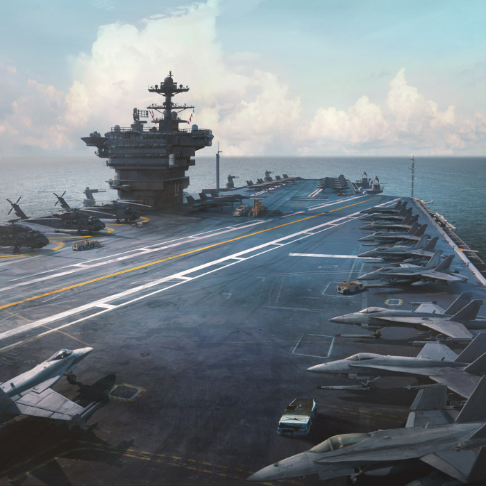 Each piece was given a distinctive colour key to ensure it worked within the game’s overall design scheme. The image for the Master Dam is used as one of the main backgrounds in the tutorial and the Naval Carrier is the backdrop upon which new unlocked characters are revealed.