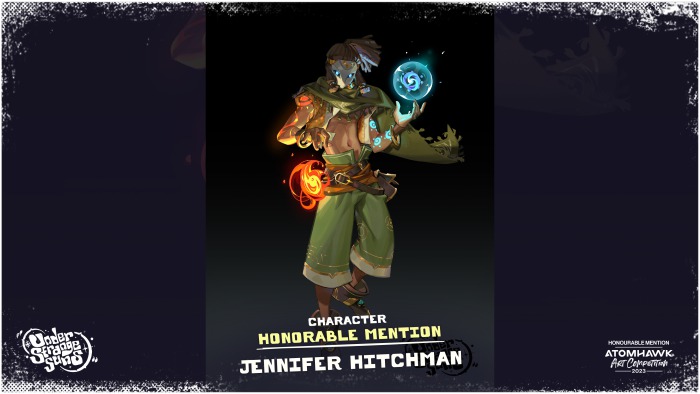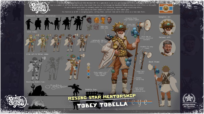 “Tobey’s artwork is a solid and very neat idea! I loved the incorporation of the brief’s theme into the design in a great and interesting way,” said Mauro Cerati, Principal Concept Artist, “From the character process to the colour variations and value comp, there is clear research shown and good taste. The overall character makes me want to discover more of the world and also encounter other Ether Vendors to see how they look like!”